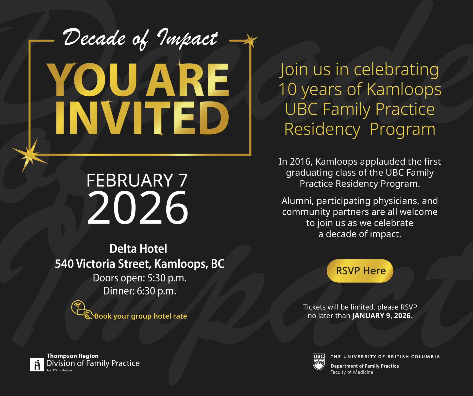 Please join us in celebrating 10 years of the Family Practice Residency Program. In 2016, Kamloops applauded the first graduating class of the UBC Family Practice Residency Program and ten years later, the program continues to grow and flourish! Alumni, participating physicians, and community partners are all welcome to join as we celebrate a decade of impact.