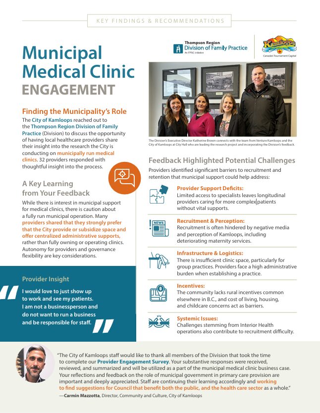 “The City of Kamloops staff would like to thank all members of the Division that took the time to complete our Provider Engagement Survey. Your substantive responses were received, reviewed, and summarized and will be utilized as a part of the municipal medical clinic business case. Your reflections and feedback on the role of municipal government in primary care provision are important and deeply  appreciated. Staff are continuing their learning accordingly and working to find suggestions for Council that benefit both the public, and the health care sector as a whole.” – Carmin Mazzotta, Director, Community and Culture, City of Kamloops.